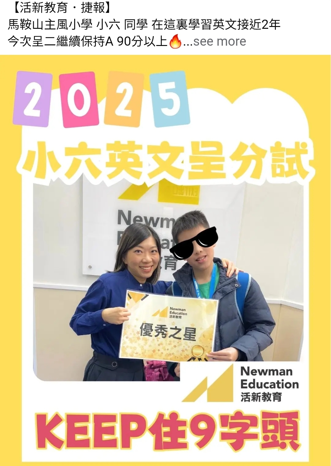 「蕭老師從我四年級開始教我,她一路支持我叫我要有信心,謝謝您令到進步15分! (拿到B級)」 - 關同學 (五年級 馬鞍山循道衛理小學)