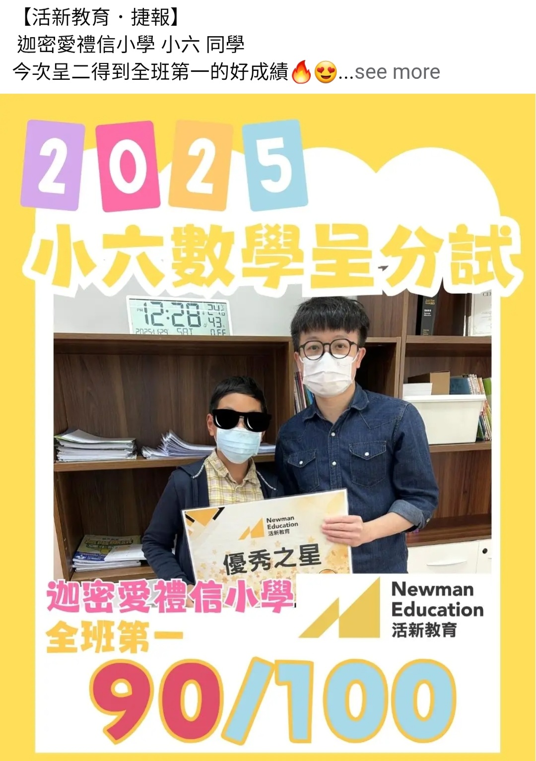 恭喜迦密愛禮信小學 小五同學 於第二學段考試獲取佳績,得到全班第一名
